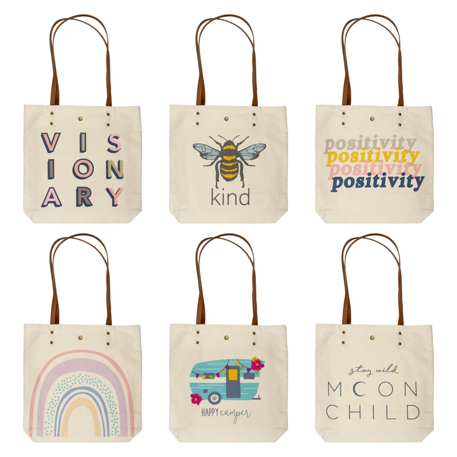 Our Canvas Book Bags are made up of 100% cotton and have leather handles. Use it to pack up your necessary items and wear it around your shoulder comfortably while showing off one of the cute designs. There is a magnetic button closure to ensure all your items stay enclosed. Pair it with our Canvas Carry All to hold your smaller items and have them easily accessible in your book bag. Gift it to a friend or yourself as a simple on-the-go bag that you can confidently rely on.