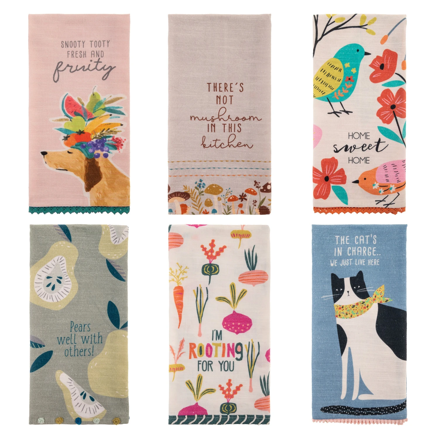 Add a touch of personality and brightness to your kitchen with our Eclectic Tea Towels. Featuring unique designs and trims, these tea towels are the perfect addition to any kitchen style. These are printed with adorable patterns and sayings and include a fabric loop to hang dry when not in use.