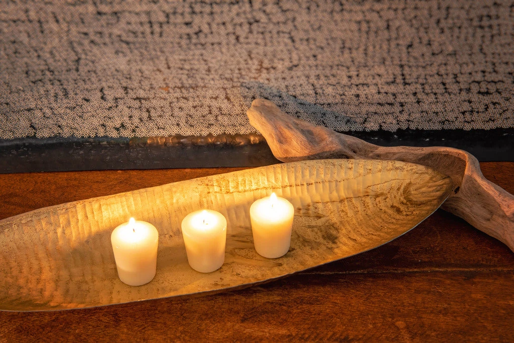 This textured gold tabletop tray is a striking piece to add to your coffee table, mantle or shelves. The bowled center is perfect for filling with baubles or candles to complete the display. Layer this piece on runners or on top of books for added interest.