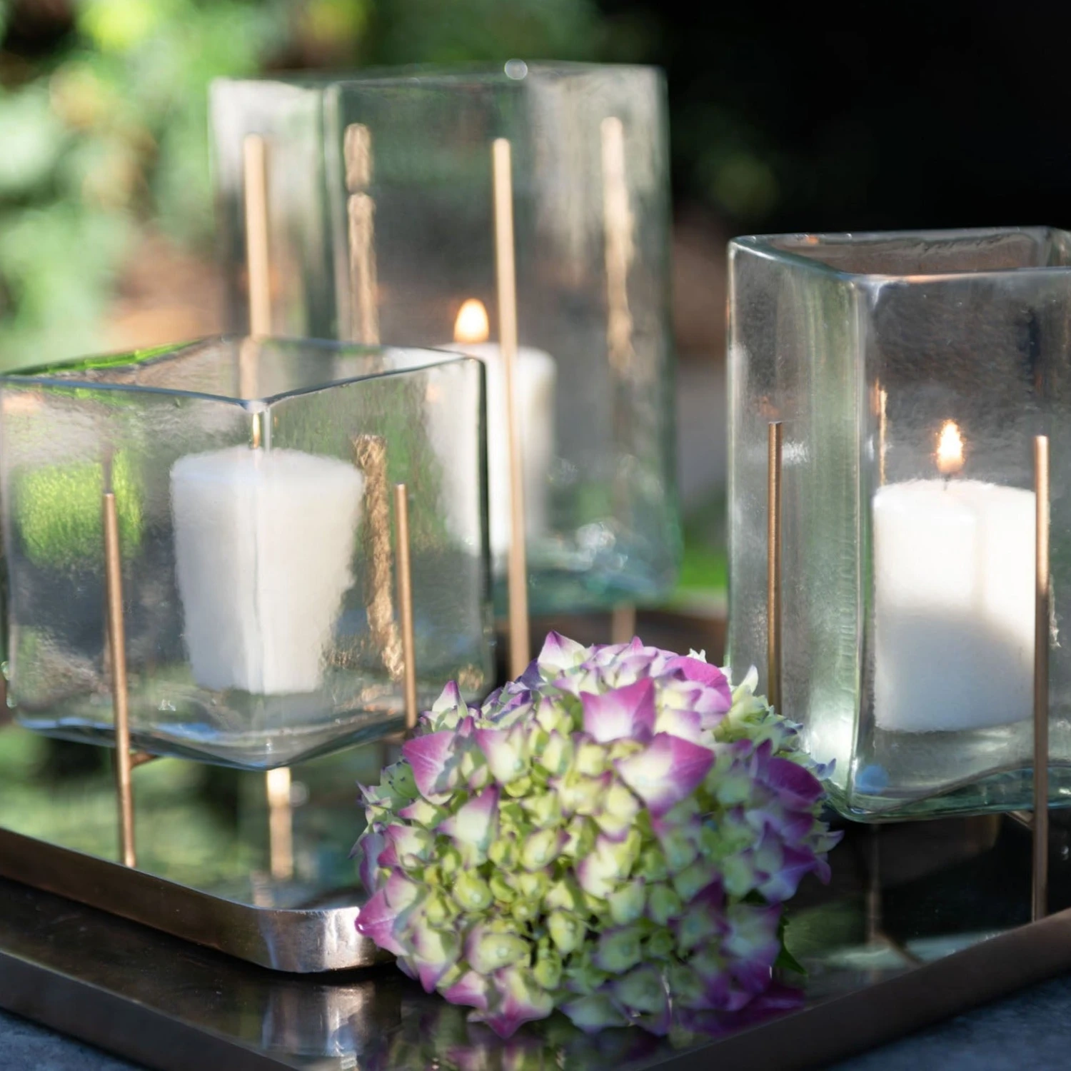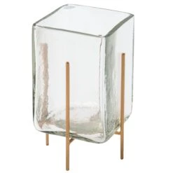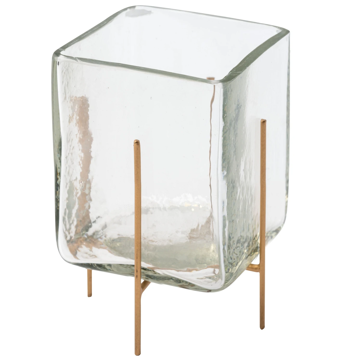 These hammered glass candle holders give new life to your favorite candles. Varying in sizes and shapes these pair beautifully together or as accent pieces around the home. Fill with your favorite candles, or go flameless and use potpourri and dried florals for a stunning visual display. Gold-finished iron feet give elevation to these chic candle holders.
