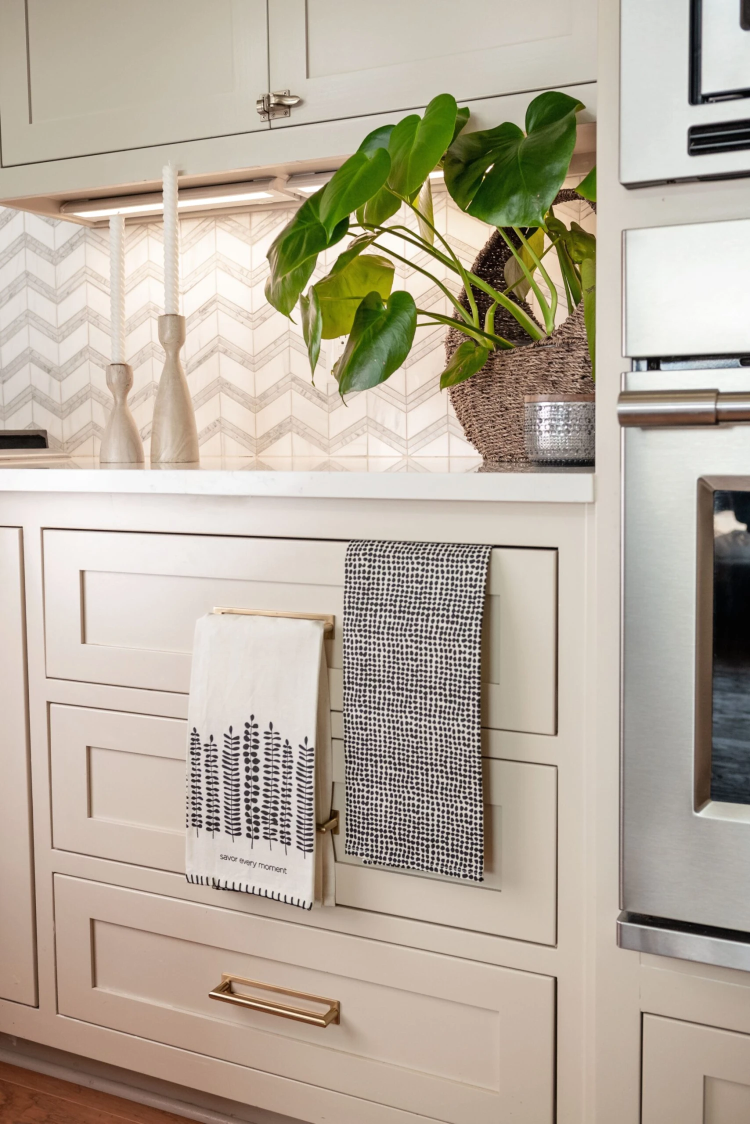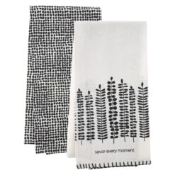 Truly savor ever moment with a tea towel that captures the essence of an elegant and clean kitchen setting. This tea towel comes in a set of 2 coordinating black and white towels. It serves as a great accent to hang on the oven, along the sink, or over a cabinet. These tea towels also come packaged in a perfect gift set with a bow tied around it.