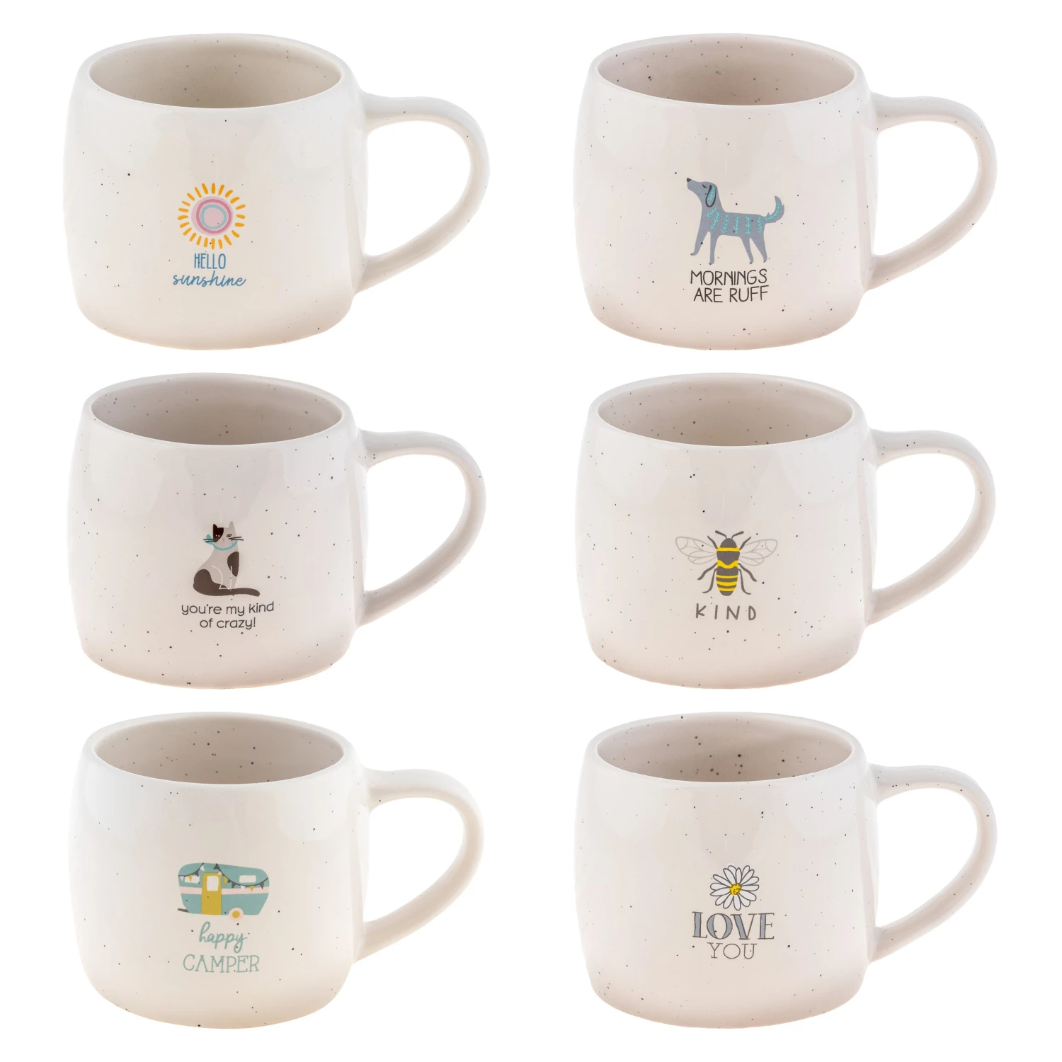 These 15 ounce tapered mugs are the perfect cozy shape to warm your hands and soul with a cup of tea or coffee. Featuring a tiny speckle of paint all over and adorned with dainty, colorful illustrations. Each mug also has a note of encouragement to add a spark to your day. Our Reese mugs pair perfectly with our Reese spatulas and tea towels to make a coordinating kitchen set.