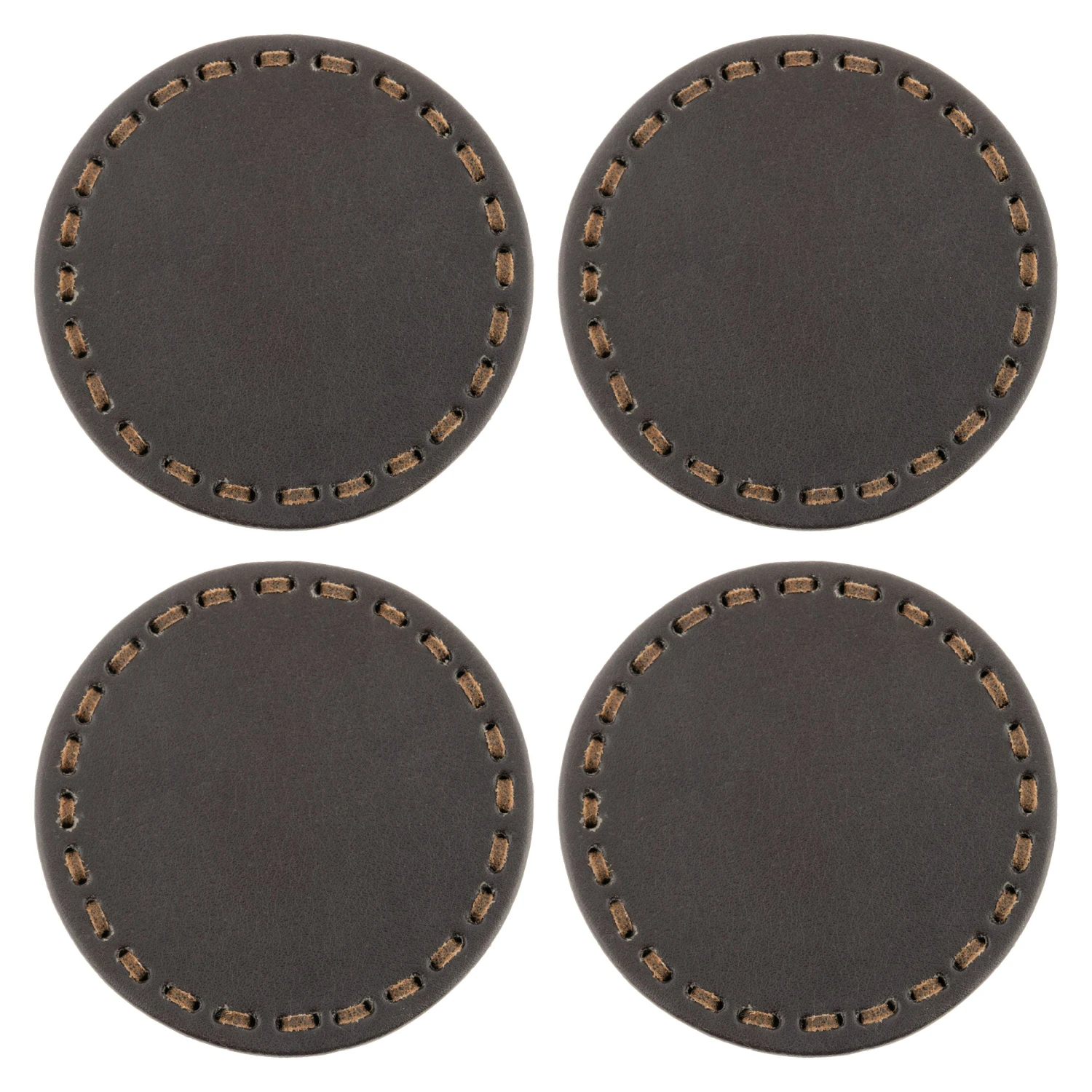 Elevate your living space with these Round Leather Coasters, crafted from faux leather with in a rich bronco brown hue. Each individual piece of the set is complete with charming complementary stitching made of upcycled, ethically-sourced leather stitching, creating a luxurious and exclusive addition to any home. Protect your surfaces and add a touch of elegance.