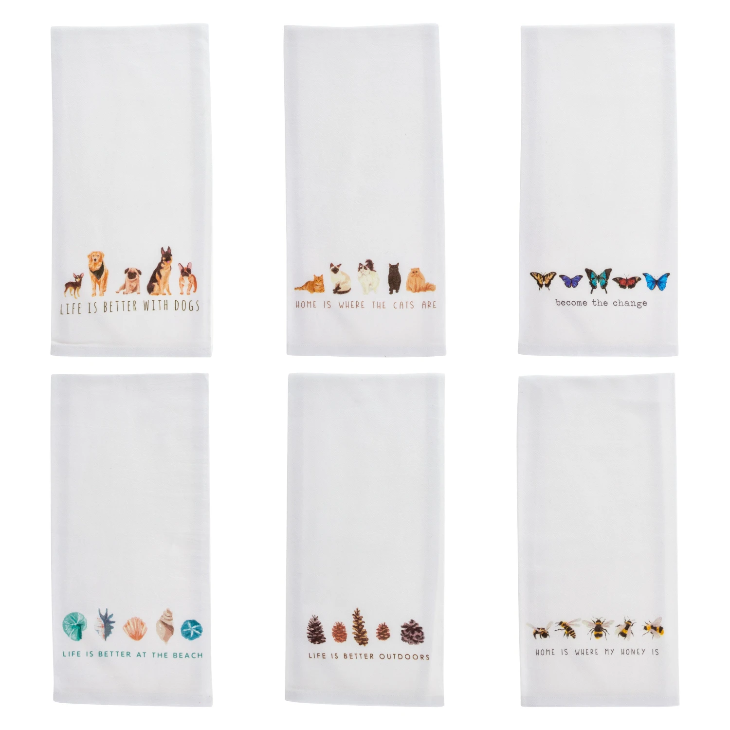Add a touch of chic to your kitchen and decorate with this collection of durable Cotton Tea Towels. Designed to help you escape the real world and step into the world of comfort, these machine washable tea towels look great and clean up well too. Each Towel includes an inside corner tab to hang dry after use.