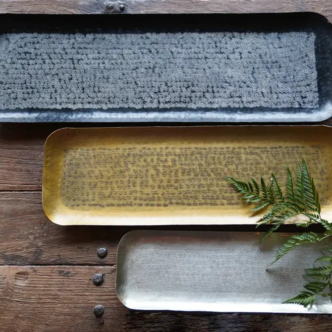 Tri-colored rectangular trays in three sizes create a unique space to display candles, collections and decor. Textured trays in metal tones of gold, silver and gunmetal offer a minimalistic style that can be used in a modern or vintage design space. Versatile in their uses and appearance these trays make an excellent selection for adding flair to home decor and dressing up a coffee table, console or counter space.