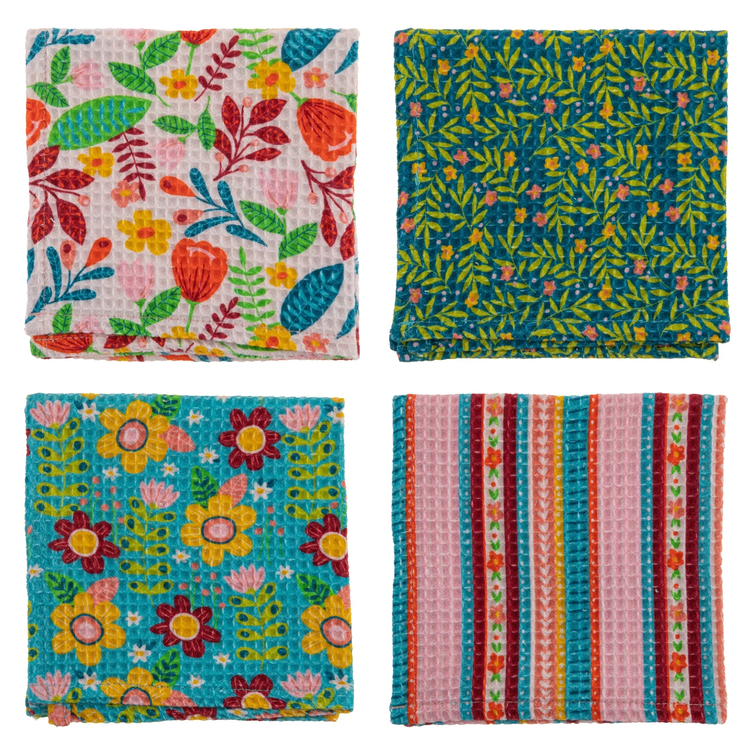 This fabulously funky set of waffle weave towels comes tied with a stylish Karma logo ribbon and coordinating pom-pom accent, perfect for hostess gifts or housewarming presents. Each cloth is printed with unique illustrations that create a perfect pop of both color and personality in the kitchen. Machine washable and soft to the touch, this set is made to last so your dish drying can be a breeze time after time.