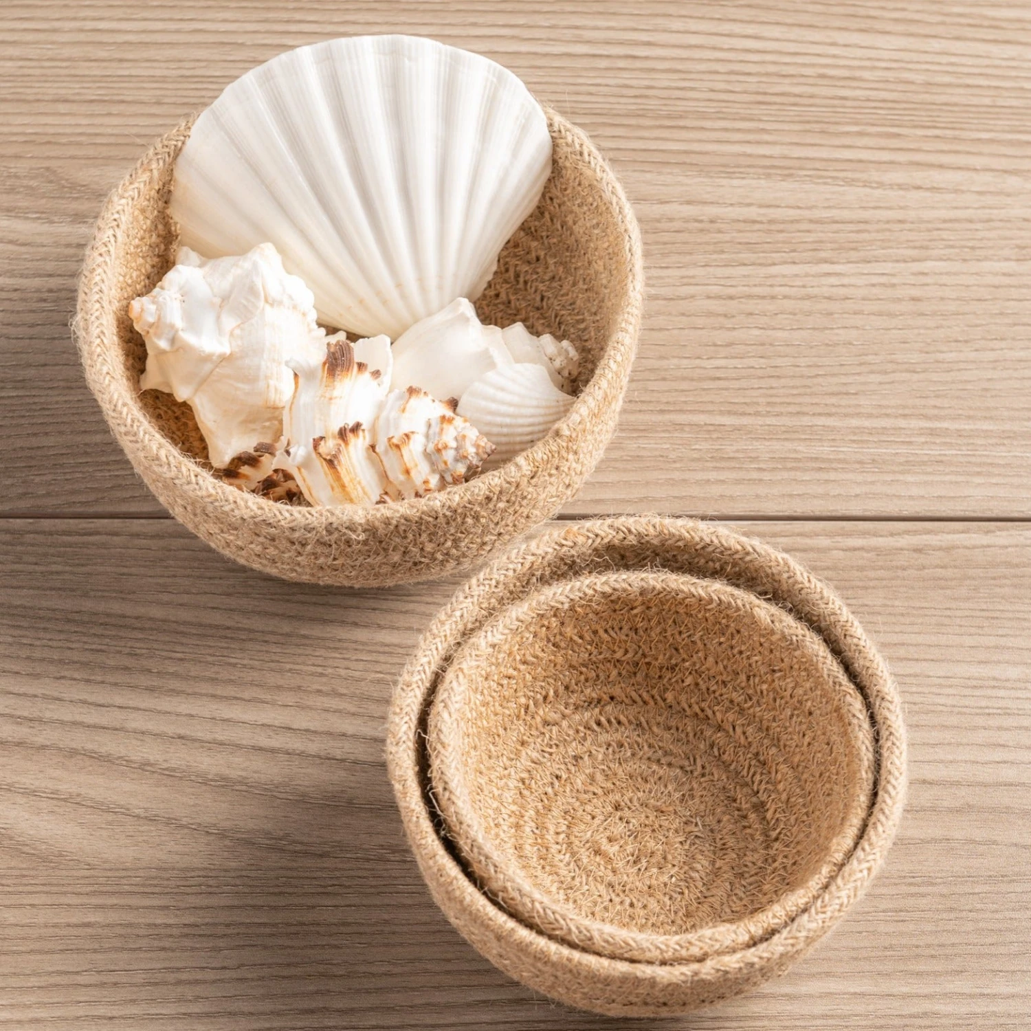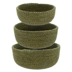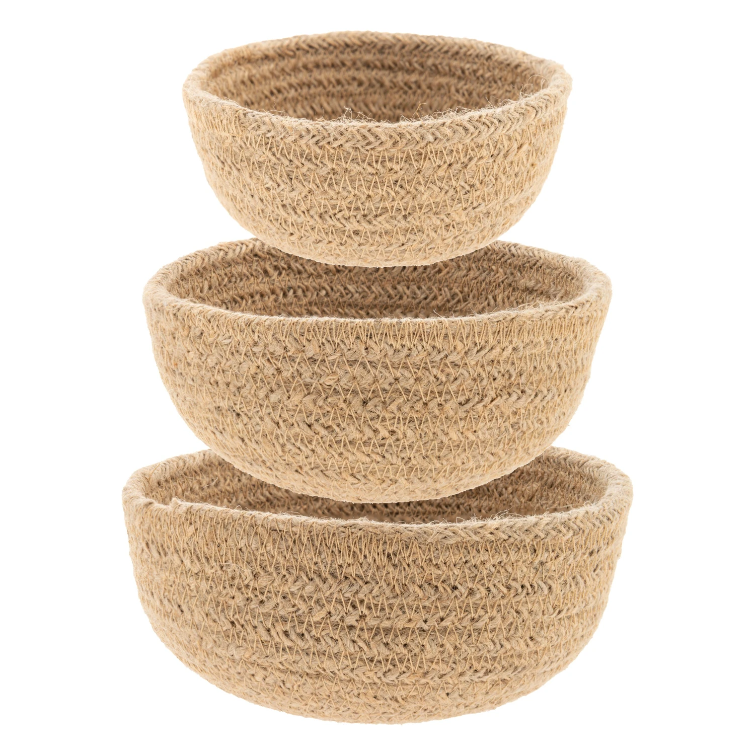 Durable and versatile these woven mini bowls are a perfect storage solution or decorative container for the home. Made with tightly woven jute in three adorable, miniature sizes these bowls can be stacked and displayed together or separated for individual use. Keep in the kitchen for fresh fruits, coffee spoons or kitchen twine storage, the living room for remote or key wrangling, the bathroom for cotton balls or swabs, or the office for paper clips and push pins. However you choose to use this set of woven jute bowls, you’ll be bringing a pop of texture into each corner of your home.